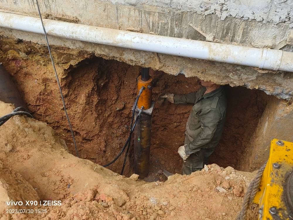 在操作坑內(nèi),利用千斤頂將預(yù)制樁逐段壓入土中。壓樁時(shí)需控制樁位,確保樁尖定位準(zhǔn)確,樁節(jié)垂直誤差不得大于15mm。